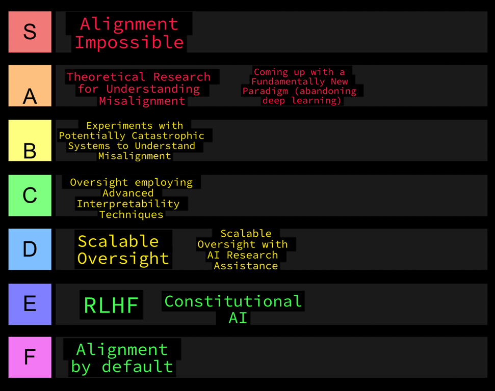F-Tier: Alignment by default. This is the idea that AI systems will align to human interests (or else not be seriously dangerous) by default, with no interventions needed.