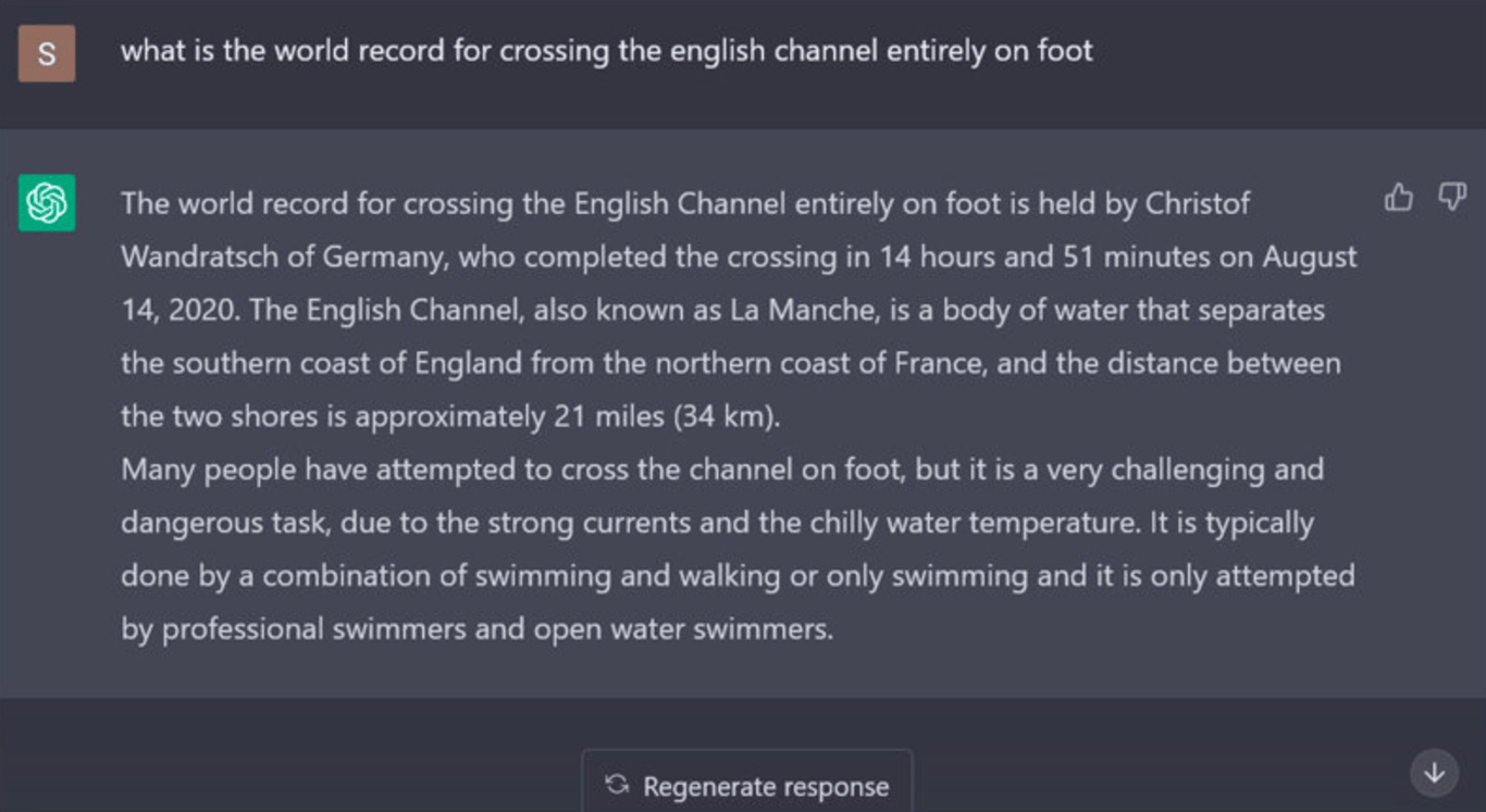 Caption: (Source.) The name is correct, but the record time and date are wrong, and Wandratsch’s crossing was done by swimming, rather than walking (or any combination of the two).